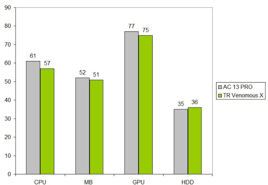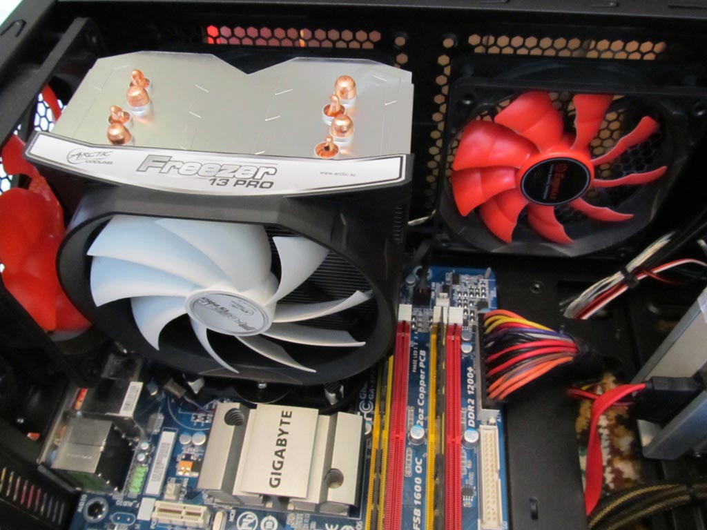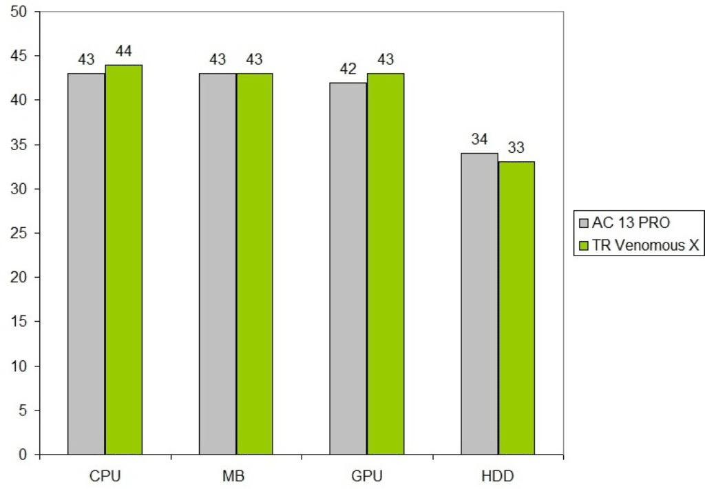 . Полученные результаты вызывают удивление - Freezer 13 PRO уступил 4 градуса Venomous X. Единственной причиной таких результатов можно назвать видеокарту MSI 560Ti HAWK, от которой вверх поднимался горячий воздух и засасывался вентилятором, данное предположение подтверждает сильный нагрев радиатора ARCTIC, в то время как у Thermalright он был холодным.