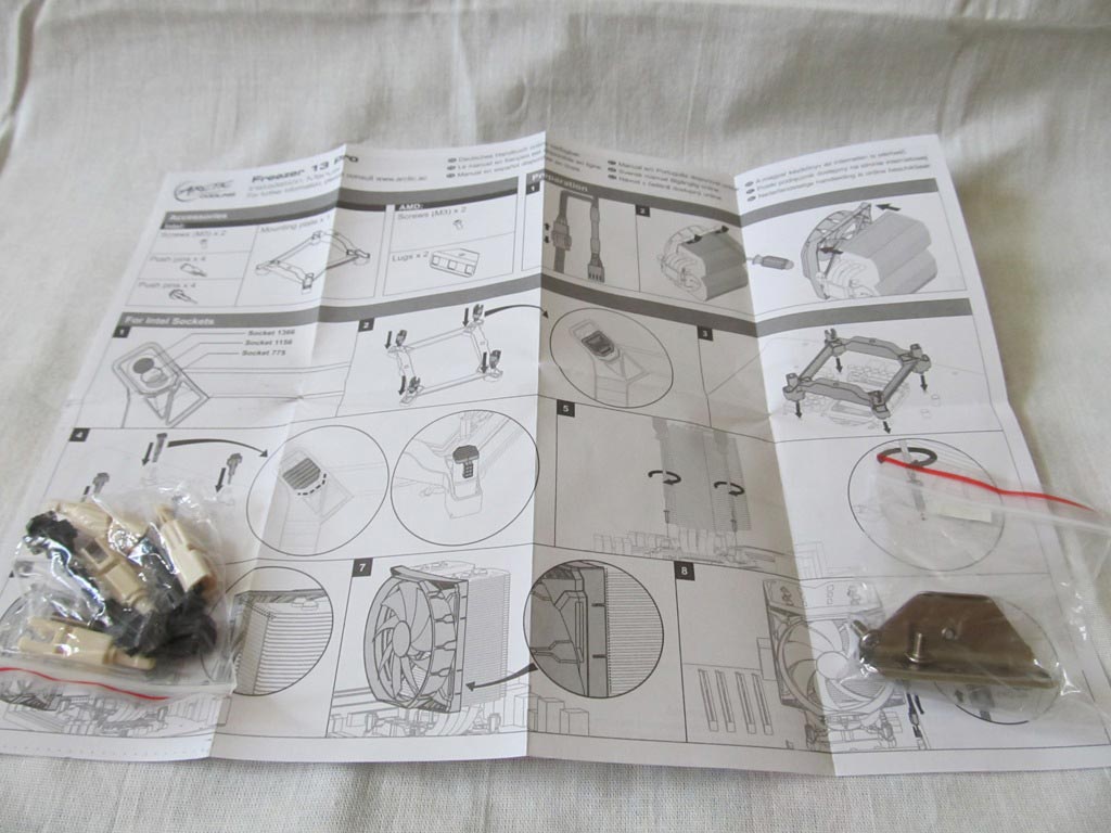 Комплект поставки включает подробную инструкцию (она пригодится при установке СО на систему от AMD) и набор необходимых креплений для установки ARCTIC Freezer 13 PRO на процессоры от Intel (LGA775, 1156/1155 и 1366) и AMD (939, AM2, AM2+, AM3, AM3+ и FM1).