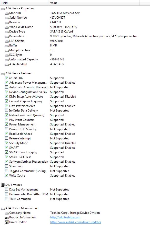 Операционной системой данный винчестер определяется как 5400 об/мин 2.5" накопитель Toshiba MK5059GSXP с 8МБ кеша: