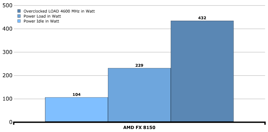 В разгоне до 4.6ГГц энергопотребление системы (990FX / FX 8150 / 8ГБ памяти/ GeForce GTX 580 / SSD) довольно впечатляющее - 432 ватта, сравните с номинальным режимом работы, почувствуете разницу. Не сказано, чем конкретно нагружалась система, но я уверен, что не стресс-тестом, а каким-либо простым приложением.