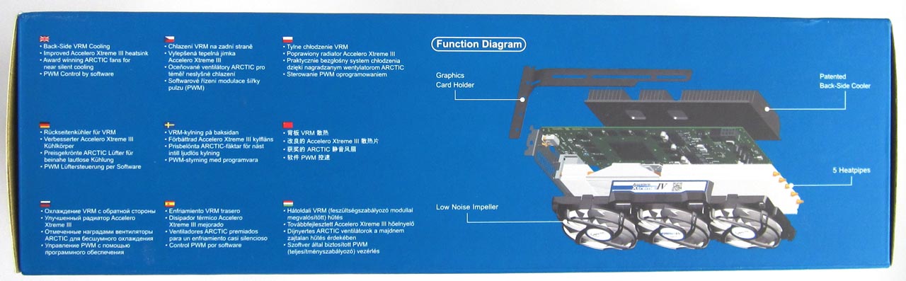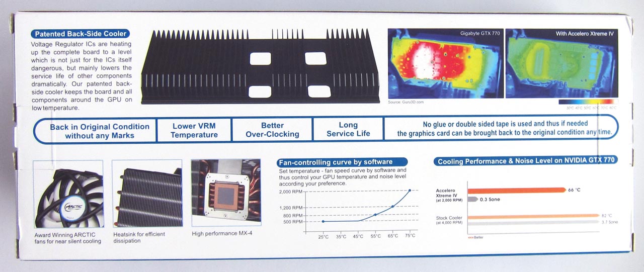 Обратная сторона коробки показывает нам новшество в кулерах ARCTIC, здоровенный бэкплейт, выполняющий функцию радиатора. Также, приведены фото с Guru3D, на которых видна польза от использования этого бэкплейта-радиатора на примере GTX 770: