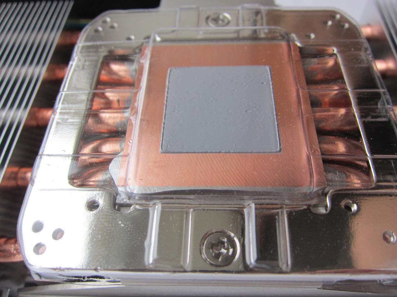 На медное основание тонким слоем нанесена термопаста ARCTIC MX-4, само основание и слой пасты защищены съёмной прозрачной крышкой.
