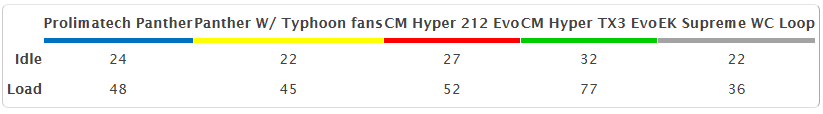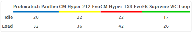 В табличке выше показано, насколько хорошо или плохо выступила та или иная система охлаждения в простое (Idle) или же нагрузке (Load). Как хорошо видно по графикам, лучше "Пантеры" показала себя только сборная СВО.