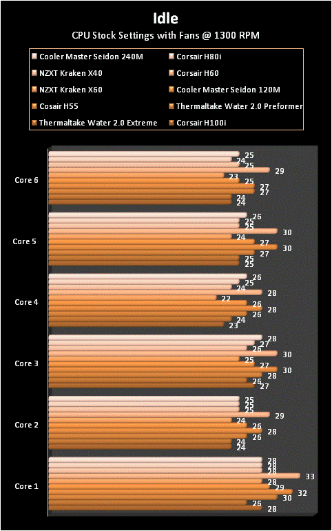 В первых двух табличках нам показывают, что процессор работал без разгона в простое (первый график) и в нагрузке (второй график). Вентиляторы на СВО работали на 1300 об/мин.