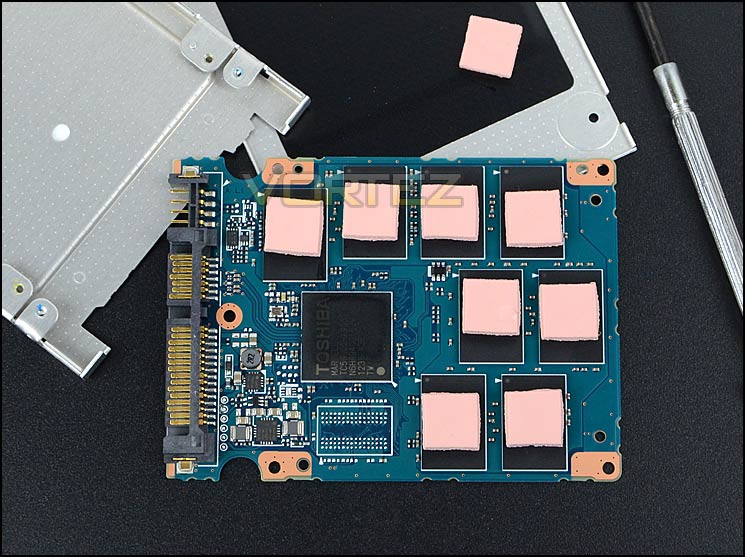 Чтобы полностью "раздеть" SSD, понадобится выкрутить целых восемь винтиков. На печатной плате можно увидеть NAND флеш память и контроллер. Последний называется TC58NC5HA9GST и представляет собой нечто, базирующееся на наработках Marvell. Память же, коей установлено 8 чипов, производства самой Toshiba (TH58TEG9CDJBA89). На все чипы на плане нанесён термоинтерфейс, который помогает в деле передачи тепла на корпус SSD.