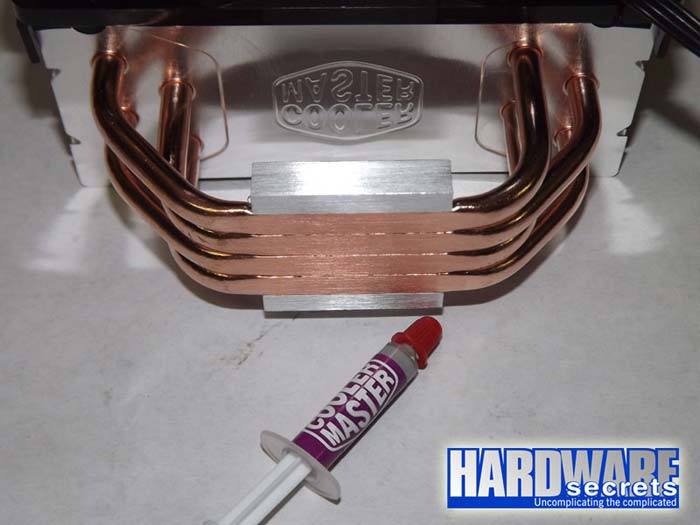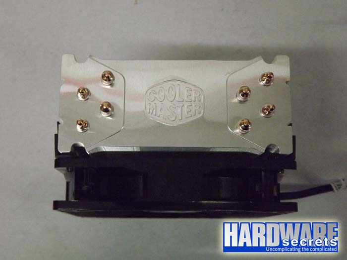 На вершине радиатора мы можем наблюдать эээммм... головки всех четырёх U-образных теплотрубок. Они ничем не покрыты, как можно заметить (тоже было и у TX3 EVO). Cooler Master обожает пихать свой логотип куда не попадя, потому мы его видим и тут...