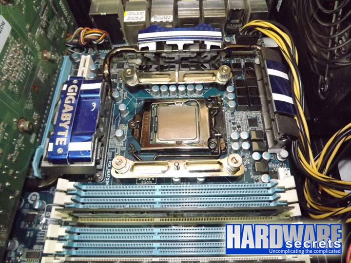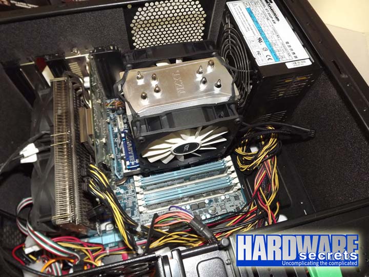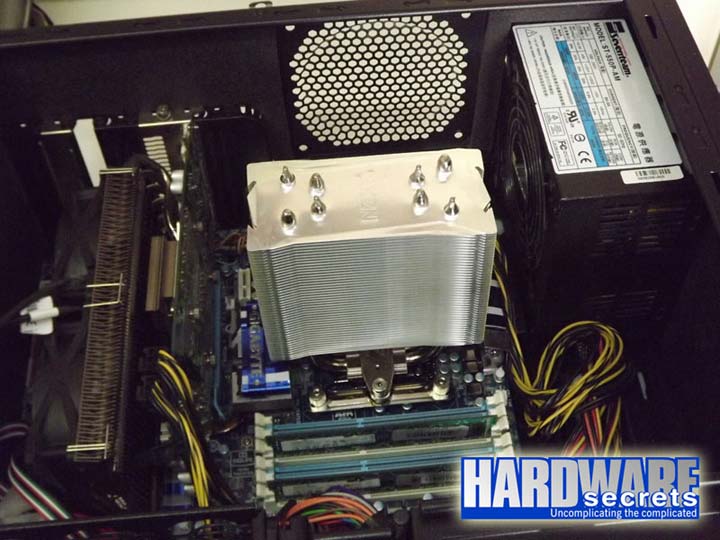 Кулер ставится на процессор (вентиляторы сняты для удобства установки), а к монтажной раме привинчивается пластина, что прижимает основание радиатора к теплораспределительной крышке процессора.