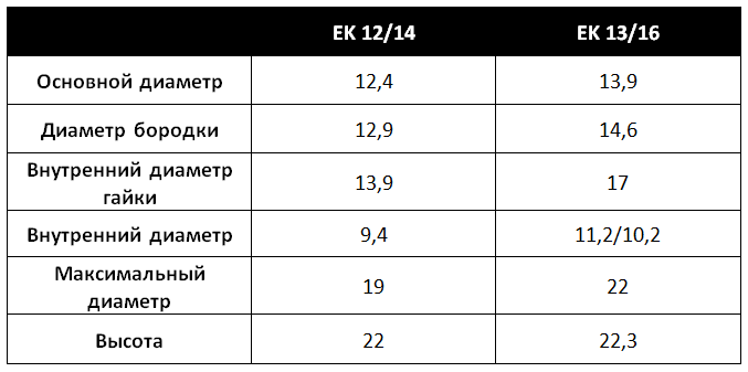EK 12/14 черный – надевается с трудом, сидит даже без гайки очень надежно. Гайка прижимает плотно и доходит до основания, полностью исключая возможность протечки. Обратно откручивается с небольшим усилием.