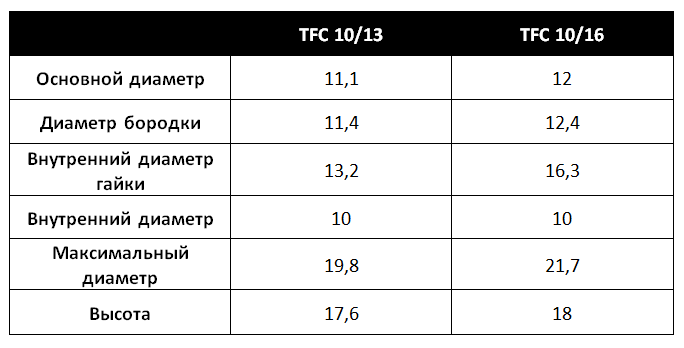 TFC 10/16 мм – надевается плотно, сидит хорошо, но верхняя гайка не доходит до основания почти на 2 мм.
