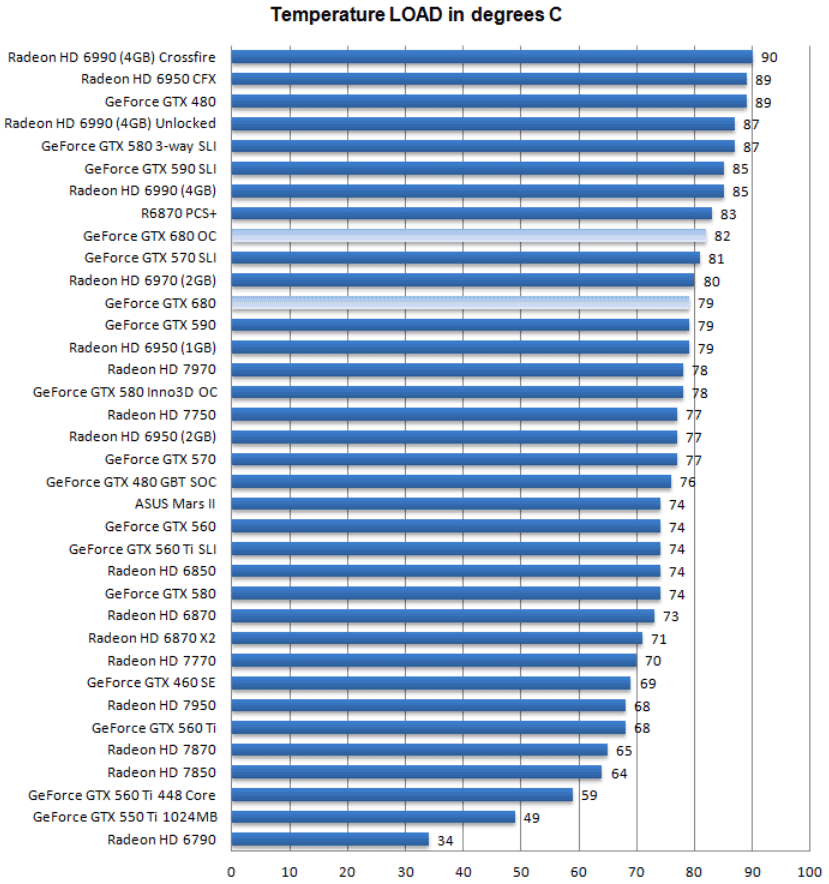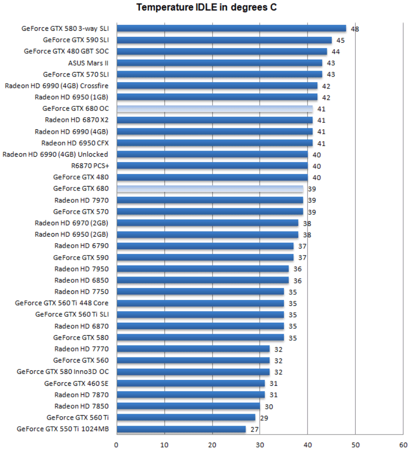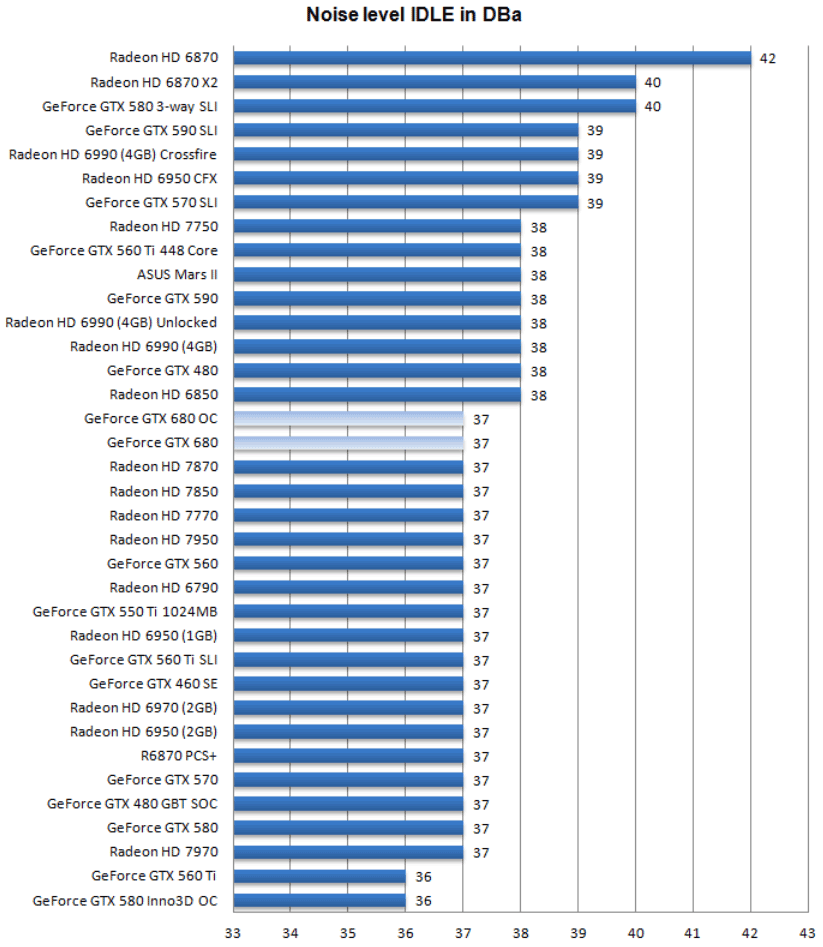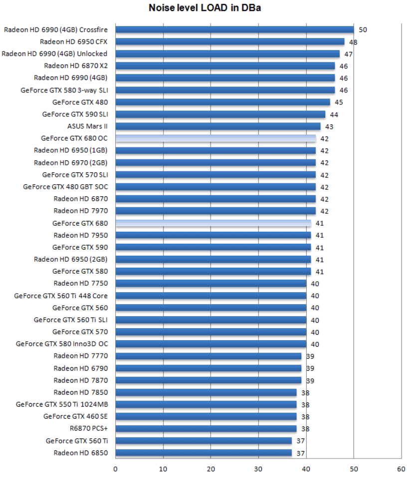 Разница между разогнанной и не разогнанной картой GTX 680 по уровню шуму составила один децибел, разумеется громче работает разогнанная видеокарта.