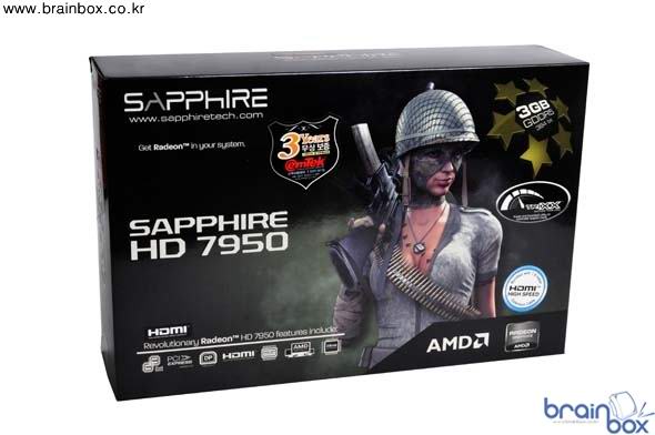 Коробка вполне типична для продукции Sapphire - на лицевой панели нас встречает новая, но не привлекательная по-старому, виртуальная дева.