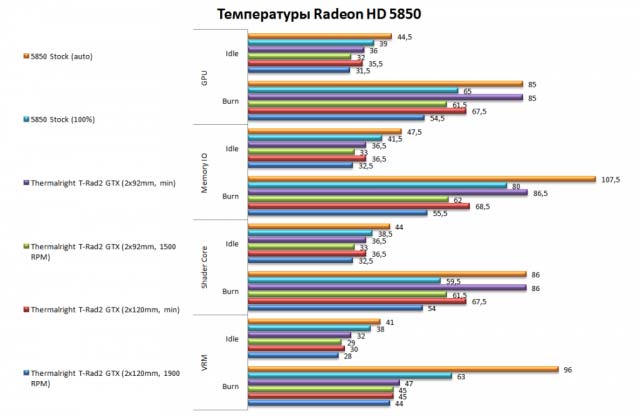 Итак, по эффективности охлаждения графического чипа Thermalright T-Rad 2 GTX превосходит стоковый кулер Radeon HD 5850 на 4 градуса в режиме максимальных оборотов при абсолютно несопоставимом уровне шума.