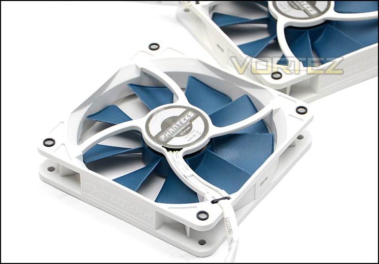 А вот и "вертушки" PH-F120HP PWM, у них по девять лопастей, в изделиях применены технологии UFB и MAFO, отвечающие за долгий срок службы и тишину в работе, в том числе из-за отсутствия вибраций. Кабели вентиляторов оплетены, выглядит всё опрятно.