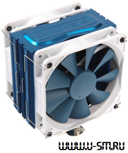 Радиатор, состоящий из двух секций. В нём применены фирменные технологии Phanteks, именуемые P.A.T.S и C.P.S.C. К ревьюверу попал кулер PH-TC12DX синего цвета.
