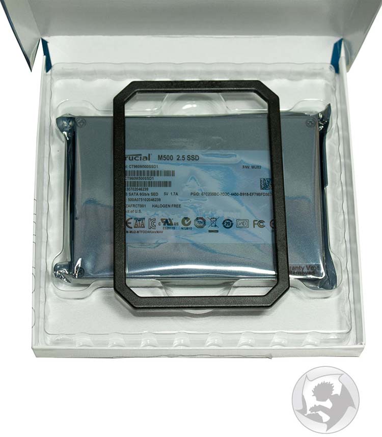Комплект поставки включает в себя переходник, позволяющий установить 7мм Crucial M500 в устройства, куда влезут только 9.5мм накопители.