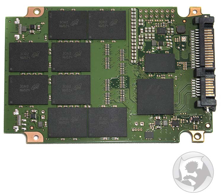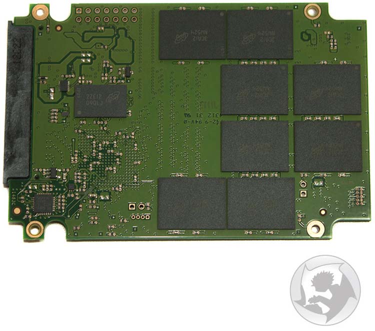Для своего нового накопителя Crucial (или лучше сказать Micron?) использовала печатную плату зелёного цвета. Мы видим хорошо знакомый нам контроллер Marvell 88SS9187, а также восемь чипов MLC NAND флеш памяти от Micron, сделанных по нормам 20нм тех.процесса, имеющийся чип DDR3 также произведён Micron. На обратной стороне печатной платы также имеются восемь чипов флеш памяти.