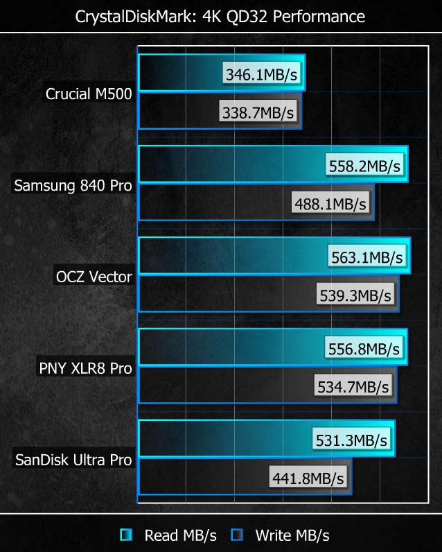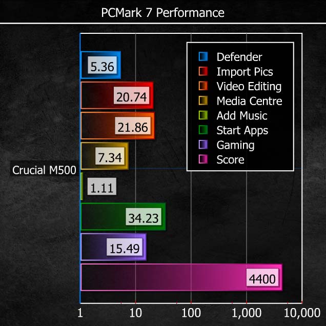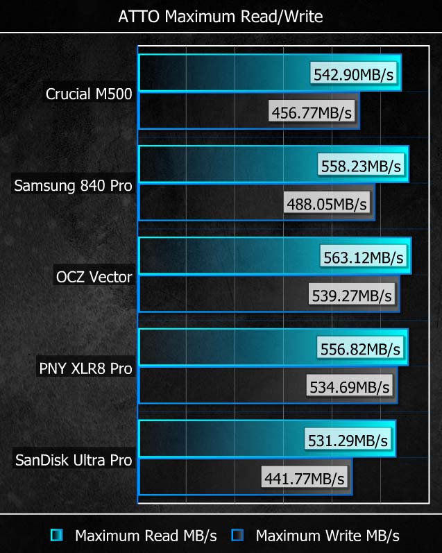 В плане скорости работы M500 выступает хорошо, результаты в тестах часто превосходят заявленные 500 и 400МБ/с (чтение и запись). В синтетических тестах новинка уступает OCZ Vector и Samsung 840 Pro, однако в real-world сценариях практически идентична им.