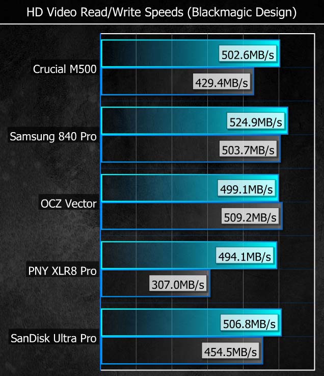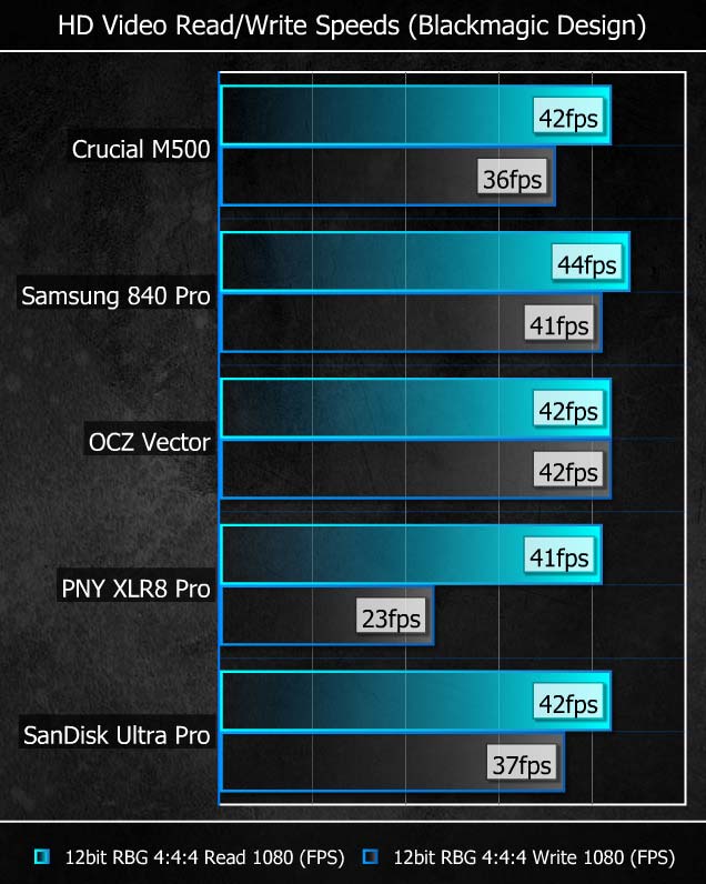 Программа от Black Magic Design проверяет дисковую подсистему на возможность скоростной работы с HD видео, результат выдаётся в кадрах в секунду и МБ/с. По результатам тестов Crucial M500 занимает место где-то посередине чартов. В данном тесте M500 впервые обогнал OCZ Vector (по скорости линейного чтения).