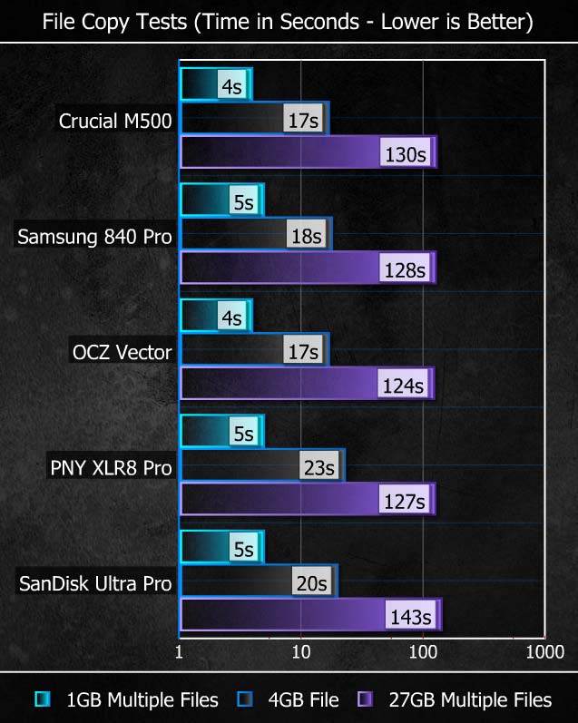 Как и в предыдущем тесте, замеряется время на ту или иную операцию, чем меньше его потрачено - тем лучше. Ситуация повторяется - крайне хорошее выступление Crucial M500 960ГБ.