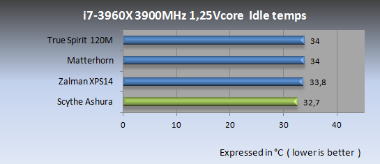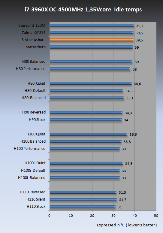 Сравнение Scythe Ashura велось с тремя воздушными кулерами: Alpenföhn Matterhorn Pure (решение той же ценовой категории, тест проводился с одним вентилятором), Thermalright True Spirit 120M и Zalman XPS14. Эти тесты проводились на процессоре без разгона, а на разогнанном в чарт были добавлены AiO СВО решения от Corsair.