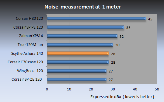 С расстояния в 1 метр уровень шума от 140мм вентилятора Hayabusa (Glide Steam) составляет всего лишь 28 децибел. Сравните с ужасом от H80 и Вы поймёте, почему приличные воздушные кулеры люди разумные всегда предпочитают "СВО из коробки" начального уровня.