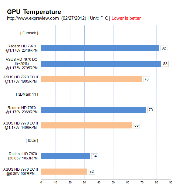 Разница в производительности равна 6.10%. Но нам прекрасно известно, что и референсный HD 7970 гонится до 1000МГц и сильно дальше, так что продукт ASUS должен радовать покупателей чем-то другим, кроме чуть более высокой производительности. Например - низкими рабочими температурами и невысоким уровнем шума. Сейчас мы узнаем, хорошо ли чувствует себя кулер DirectCU II на графическом чипе Tahiti.
