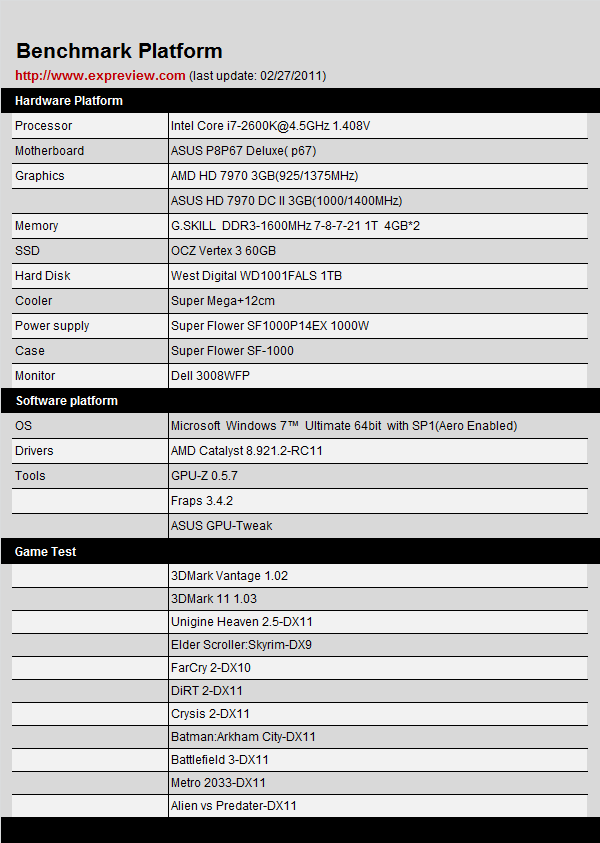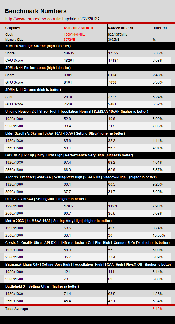 А вот и бенчмарки, уважаемые читатели. Разогнанная (пока используется только заводской разгон) ASUS Radeon HD 7970 DirectCU II TOP против референса на частотах по-умолчанию: