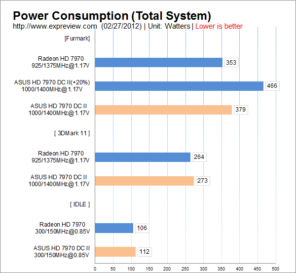 Как можно понять, рабочие температуры у ASUS Radeon HD 7970 DirectCU II TOP ниже, чем у референса во всех режимах работы, при этом кулер работает на меньшей скорости, так что DirectCU II вполне достойно справляется с охлаждением Tahiti даже в "Бублике", что уж говорить про "3ДМарк 11".