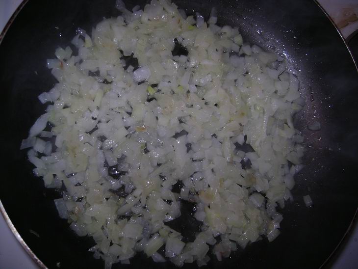 2. Тем временем, пока варится наша картошечка, чистим луковицу, затем мелко её режем и обжариваем на растительном масле (при этом не забываем помешивать) - вот так мы начали готовить начинку.