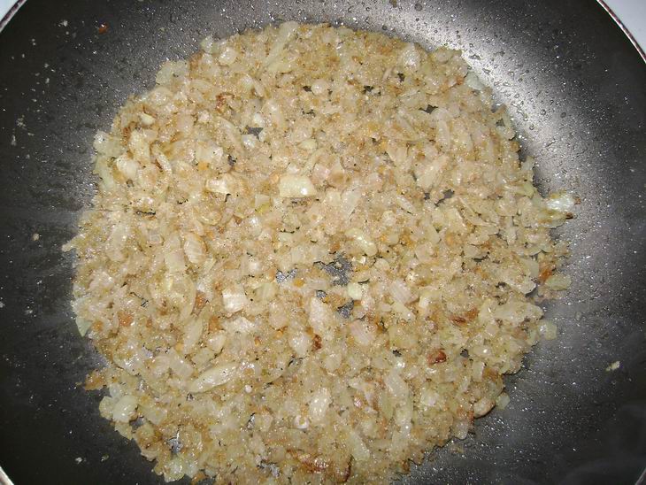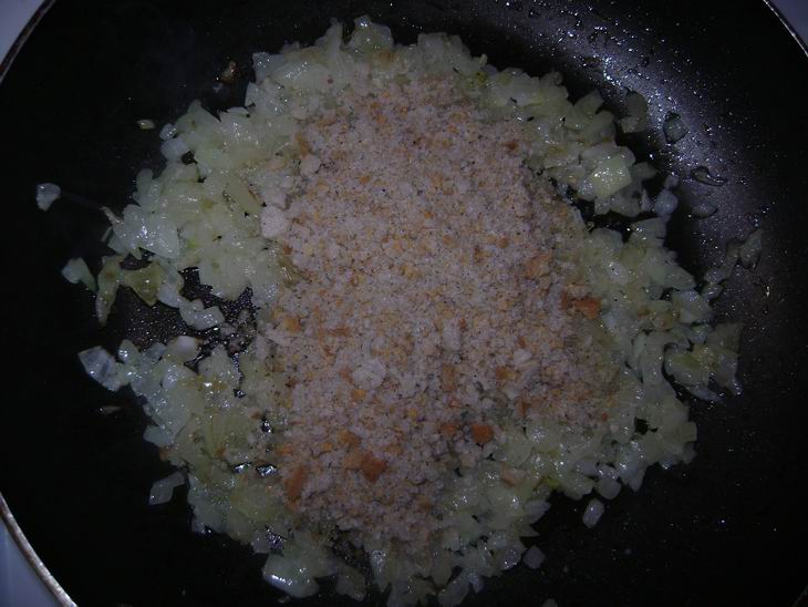 3. Через минутку к луку, который жарится на сковороде, добавляем панировочные сухари и продолжаем жарить до золотистого цвета.