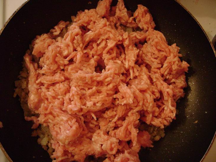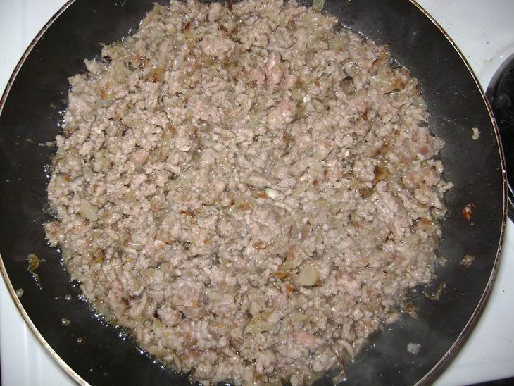 4. Как только смесь из лучка и сухарей приняла золотистый оттенок, добавляем сырой мясной фарш, соль, перец, прочие специи по вкусу и продолжаем жарить до готовности фарша. На это должно уйти ~15 минут.