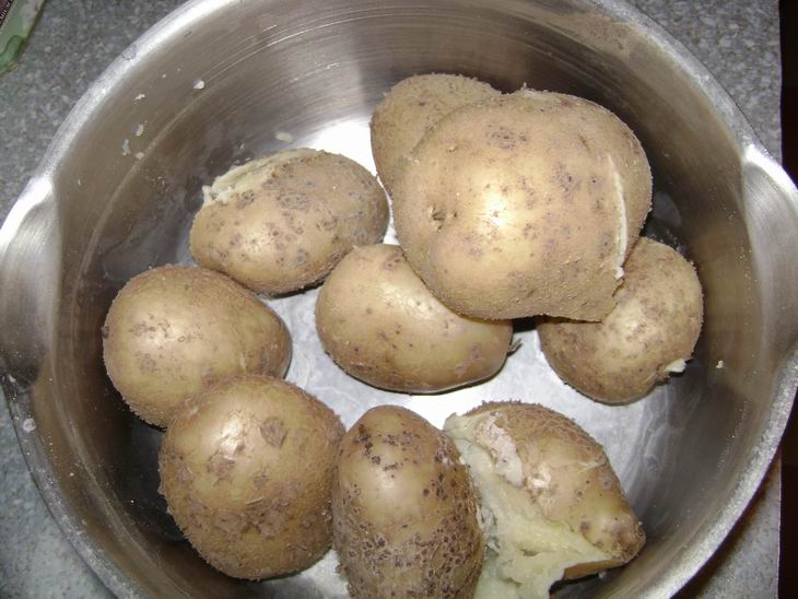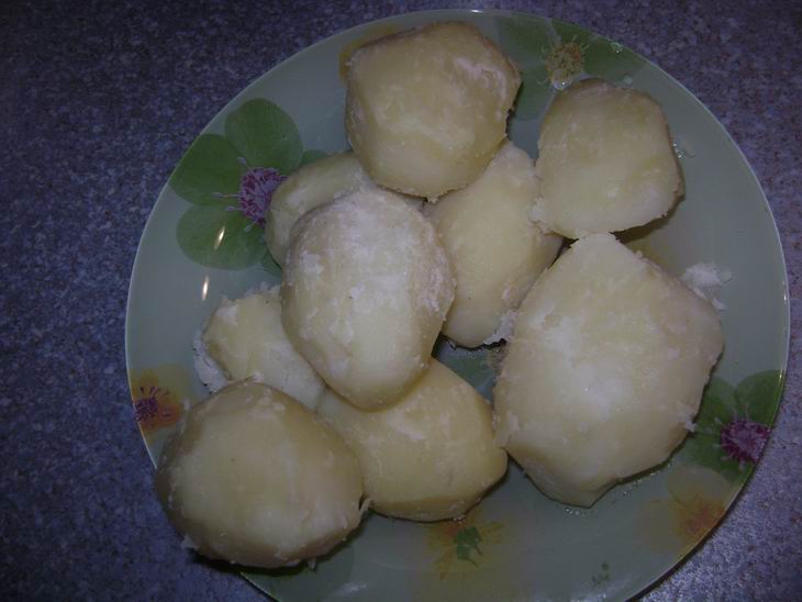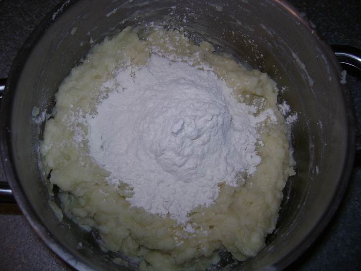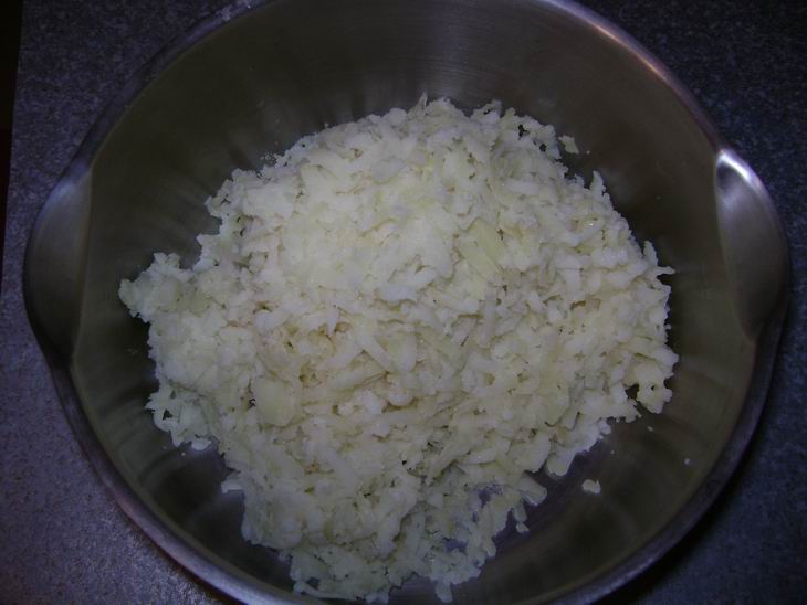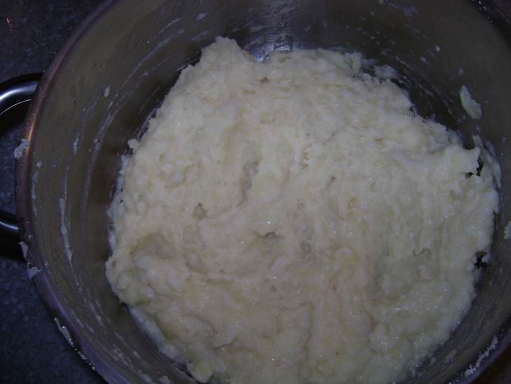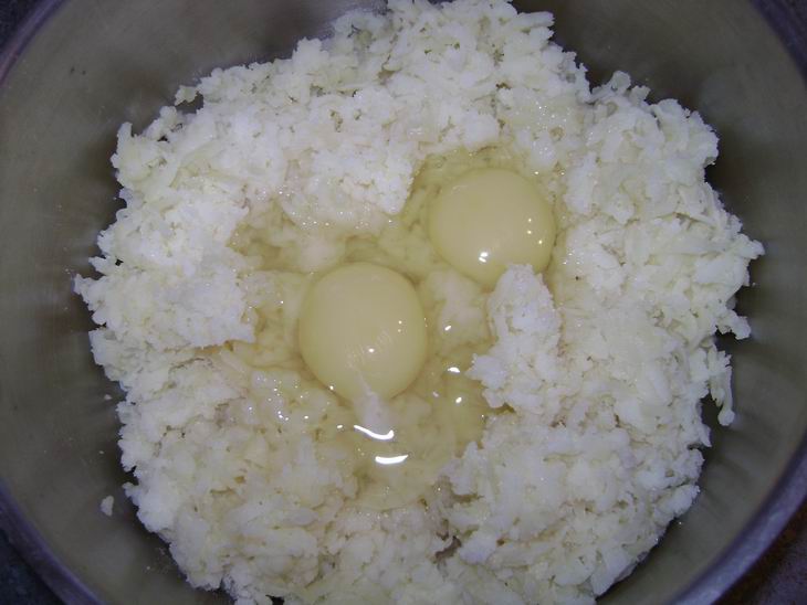 5. Уже остывшую картошку чистим и натираем на тёрке. Затем смешиваем её с солью, яйцами и мукой (муку потребуется добавлять до того момента, пока тесто не будет приставать к рукам).