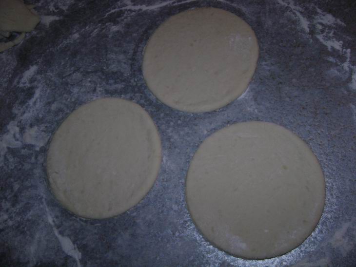 6. Тесто можно разделить на шарики и из последних раскатывать лепёшки или же раскатать тесто в пласт (~ 0,5 см толщиной) и, каким-либо предметом из посуды (в нашем случае поработала бульоница), вырезать ровные по форме эти же самые лепёшки.