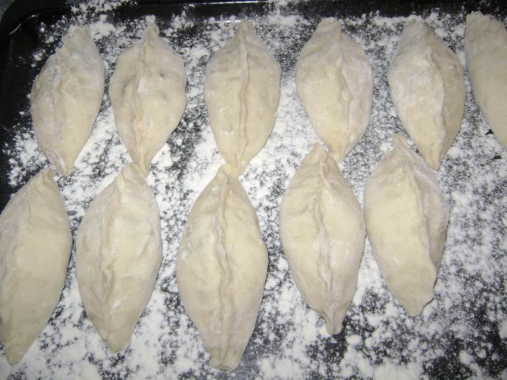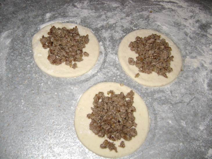 7. Начинаем лепить наши колдунчики: в центр каждого вырезанного «блинчика» кладём начинку из фарша, края защипываем аккуратно.