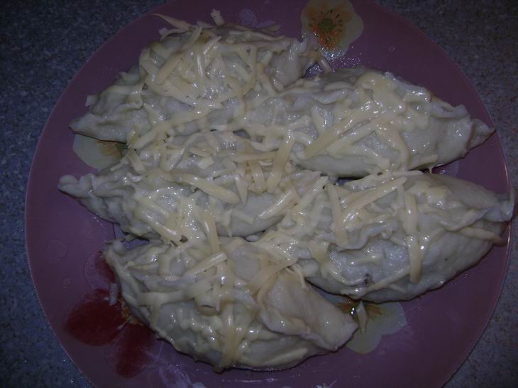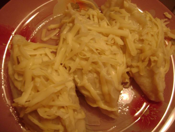 9. Как почувствовали, что они готовы мы их бережно достаём из кипящей воды, поливаем растопленным маслом и посыпаем тёртым сыром.