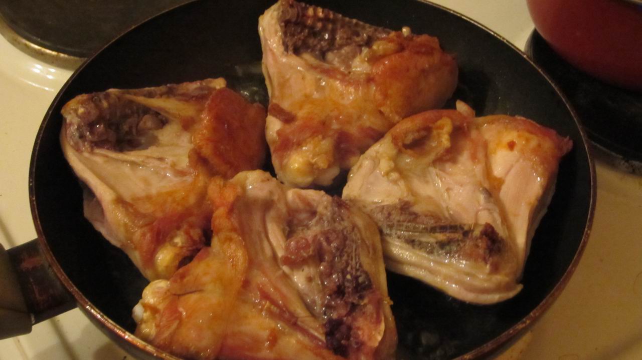 1. Куриные детали (у нас бёдрышки оказались в наличии) промыть, обсушить и обжарить до золотистого цвета на "большом огне".