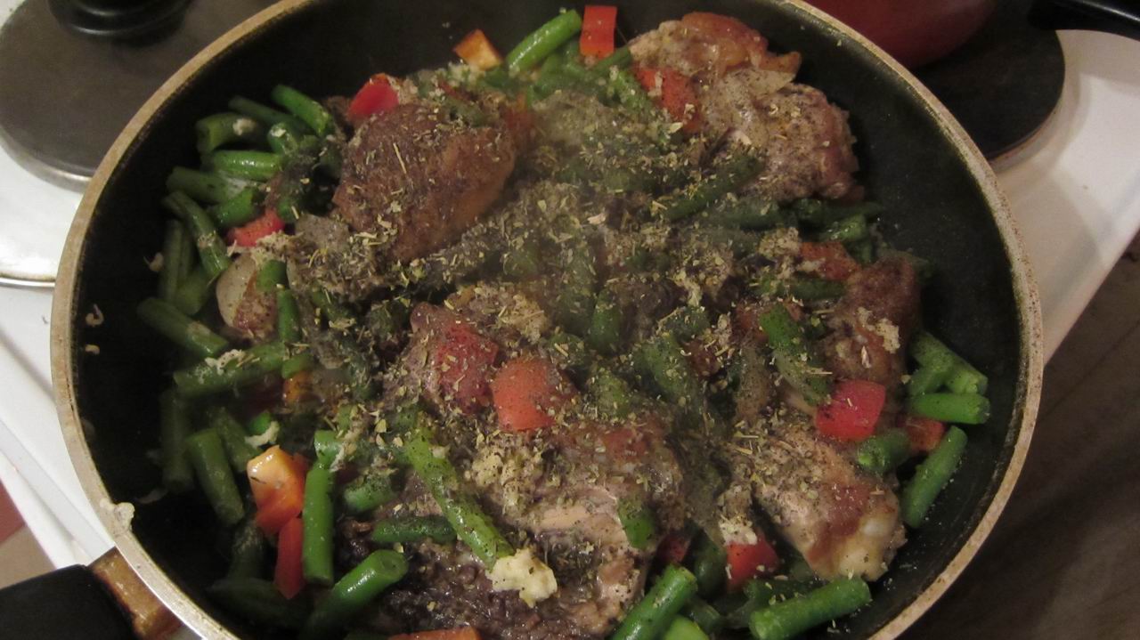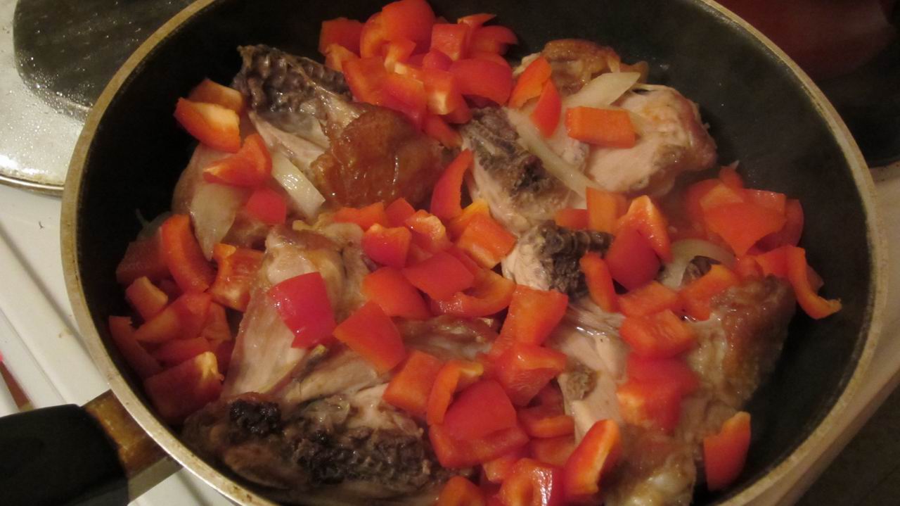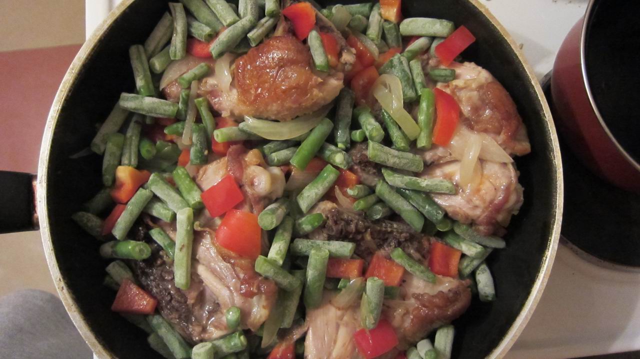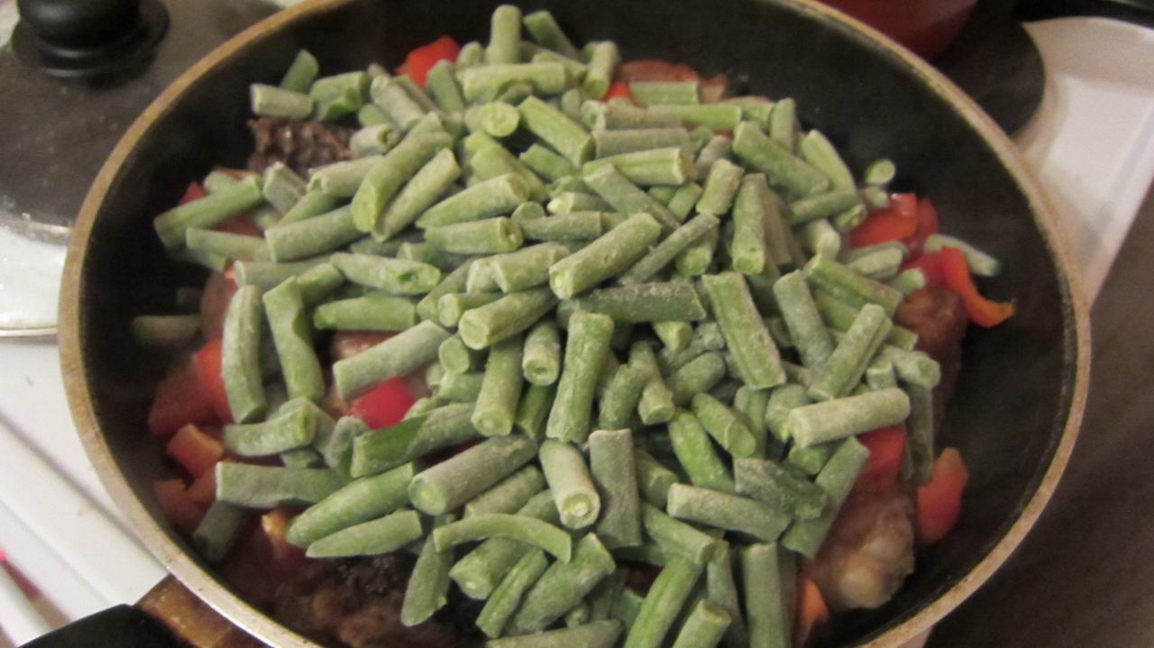 3. Готовим перец - моем, чистим, режем. И уже вместе с фасолью отправляем его на сковородку к курице и луку. Обжариваем всё минут ~пять.