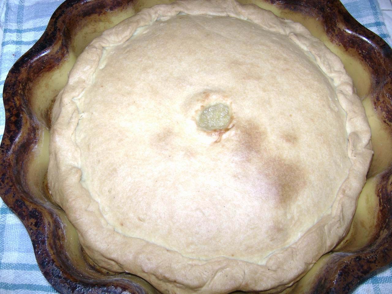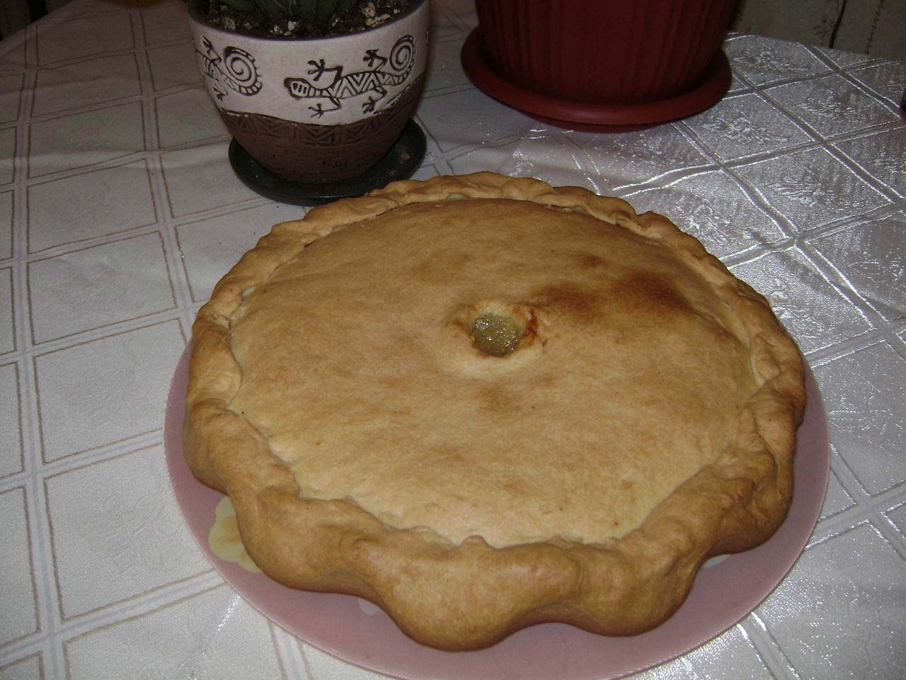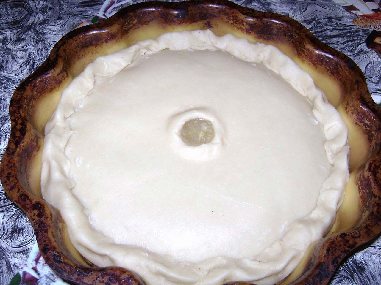 6.Меньшую часть теста раскатать потоньше и накрыть начинку, края защепить. В середине пирога вырезать дырку, чтобы выходил пар.