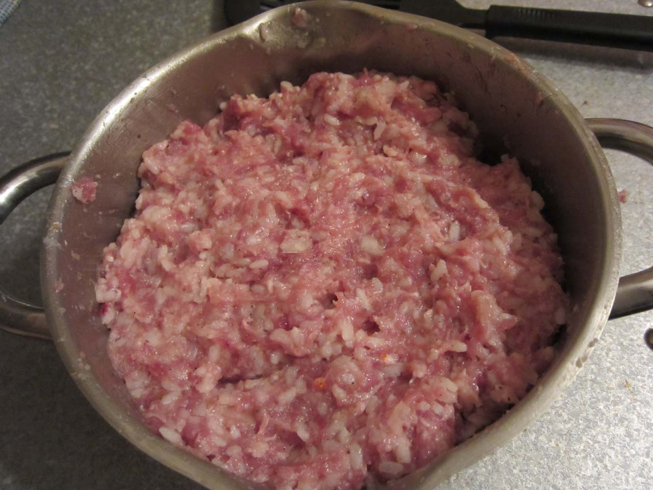 1. Свиное мясо пропустила через мясорубку. К полученному фаршу добавила мелко порезанный лук, пропущенный через пресс чеснок, варённый рис, яйцо, соль, перц - всё очень хорошо перемешала.