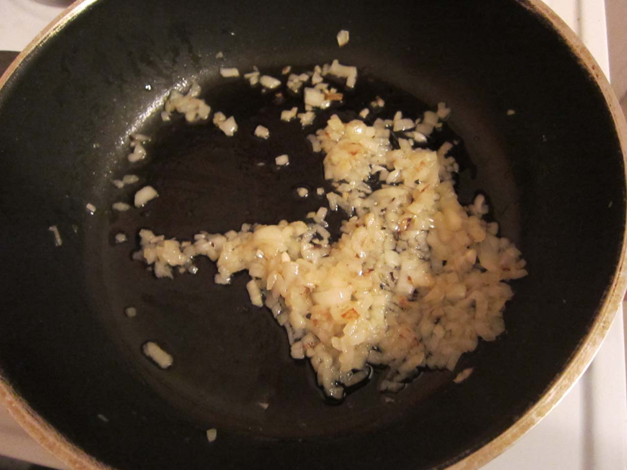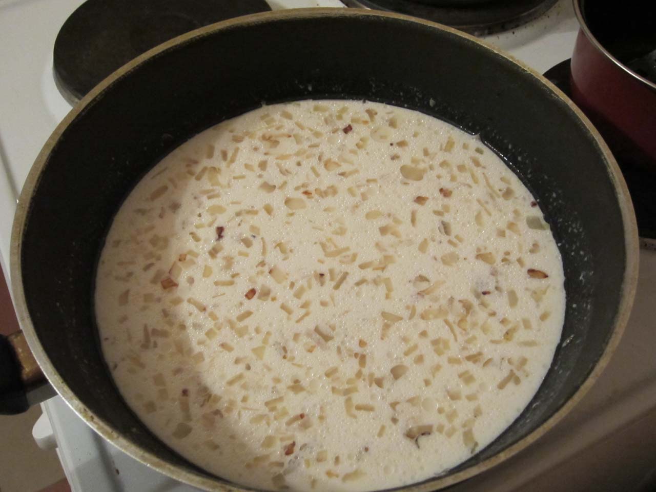 На несколько минут оставила миску с содержимым в покое и взялась за лук - порезала, обжарила до прозрачности. Перелила молочную смесь в сковородку к луку (кстати, комочки осели и я их оставила в миске на дне), довела до кипения и поварила до лёгкого загустения.