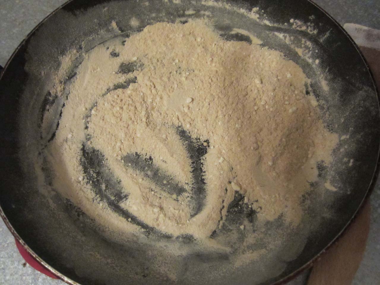4. Дальше занималась соусом - на сухой сковороде обжарила муку до светло-коричневого цвета, пересыпала её в миску и аккуратно, неторопясь стала туда вливать небольшими порциями молоко и при этом интенсивно вилкой помешивала, воизбежании комков. Скажу честно, у меня не получилось сделать смесь из муки и молока без комочков.