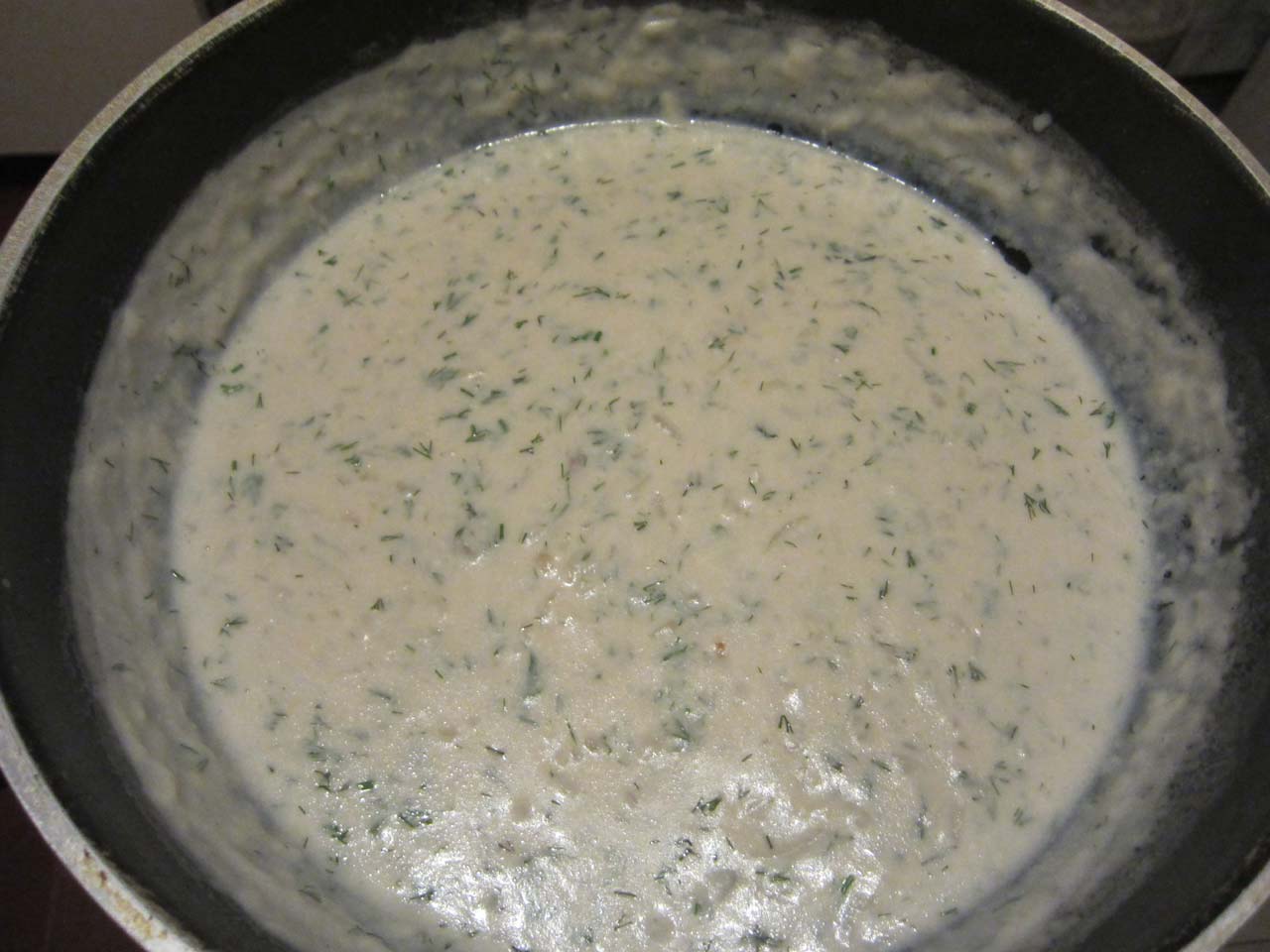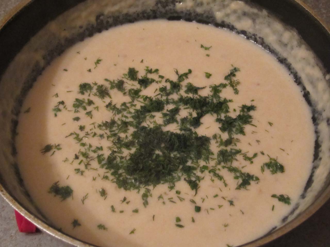 Сняла соус с горячей плиты, мелко порезала туда укроп, посолила и приправила слегка мускатным орехом.