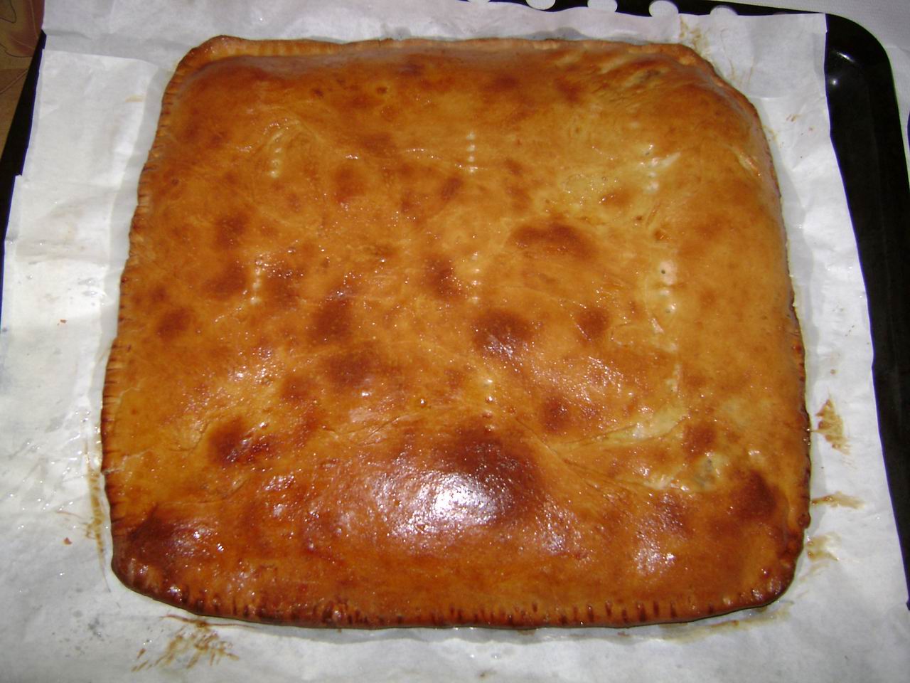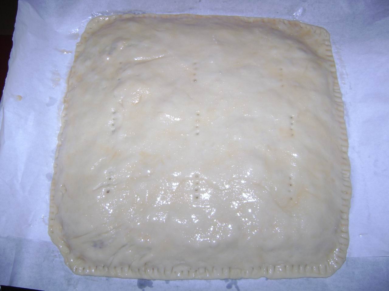 4.Смазать пирог слегка взбитым яйцом и оставить полежать для поднятия минут 10-15. Выпекать в духовке при температуре 180-200 градусов минут 30, до зарумянивания.