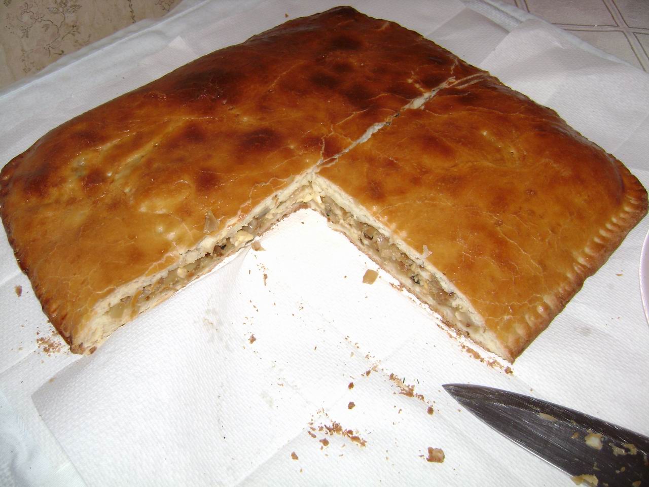 3.Оставшееся тесто раскатать еще в один пласт и накрыть им начинку, края пирога защипнуть.