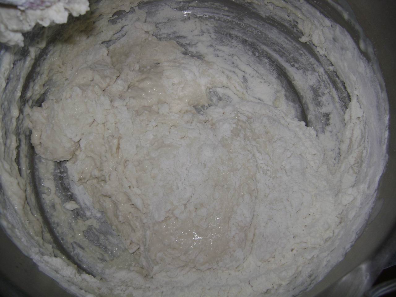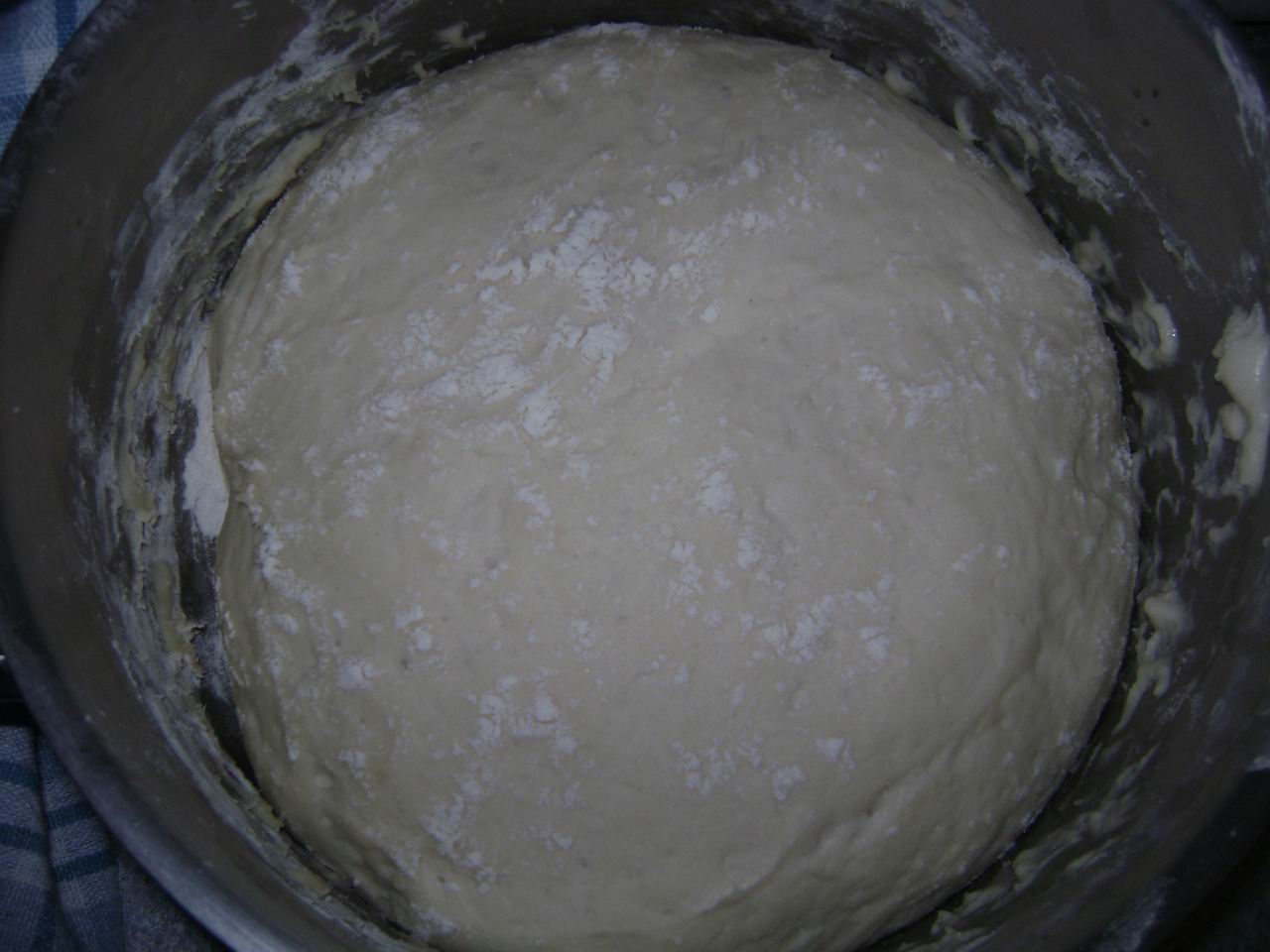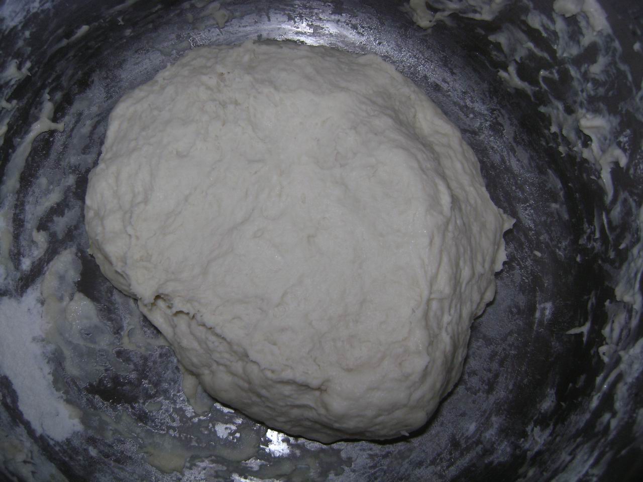 3.Постепенно добавлять муку и перемешивать тесто, добавить растительное масло и месить тесто еще минут 15. В тесте не должно быть комочков и оно не должно липнуть к рукам. Поставить тесто в теплое место, примерно через 1 час тесто поднимется, обмять его и оставить еще минут на 30 -40 до второго поднятия.