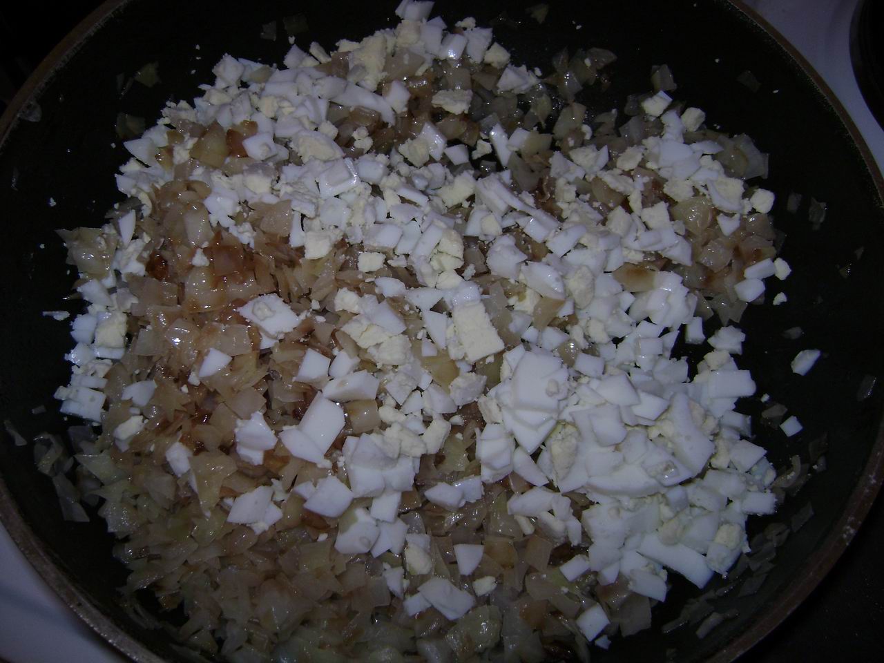 2.Яйца отварить, очистить от скорлупы, порезать и перемешать с капустой, добавить соль по вкусу (заботящиеся о своём здоровье люди её не добавляют вовсе).