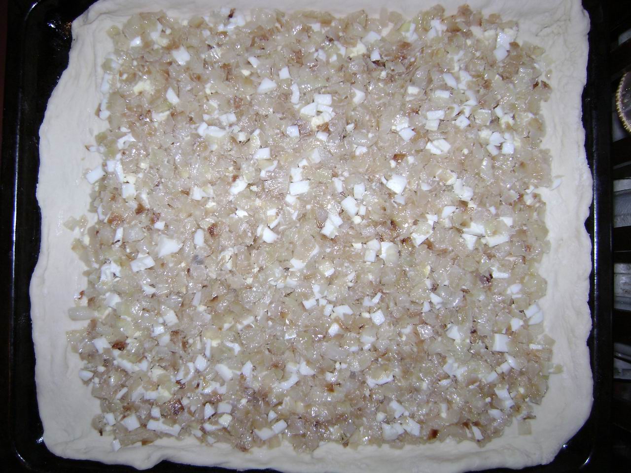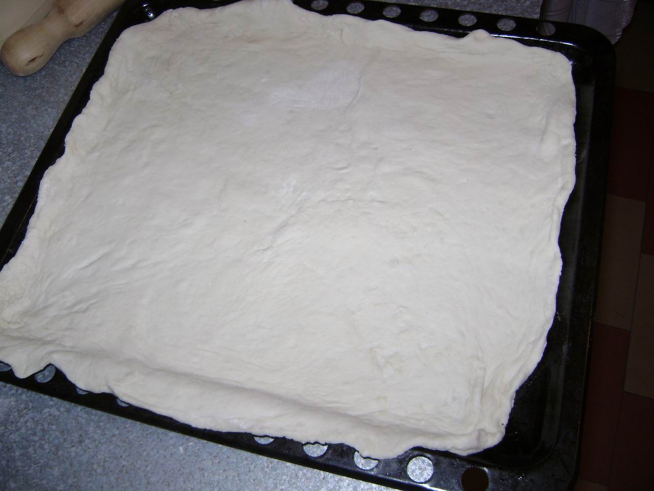 1.Часть теста раскатать в ровный пласт толщиной примерно 1. 5 см, выложить на противень, смазанный растительным маслом.