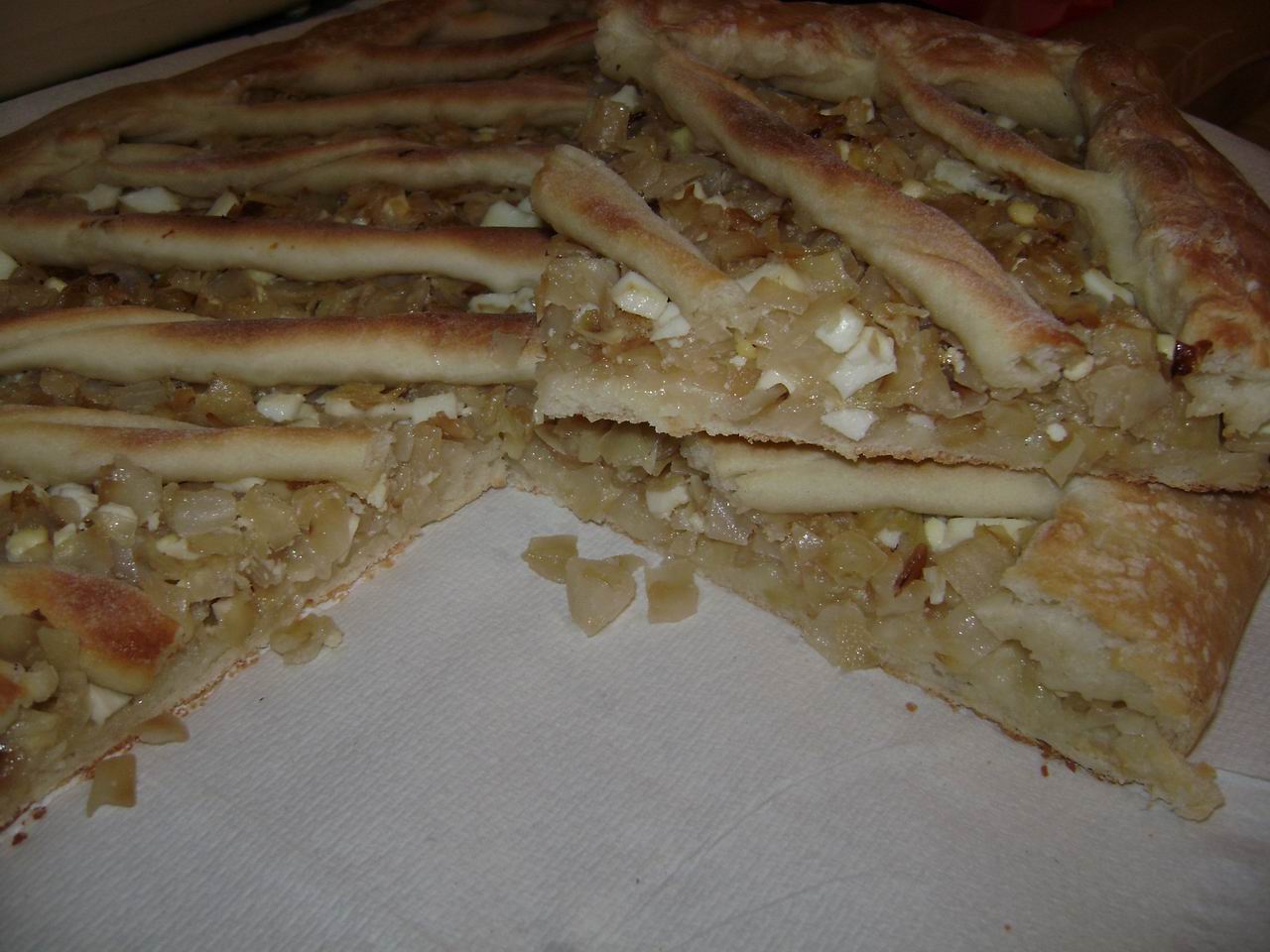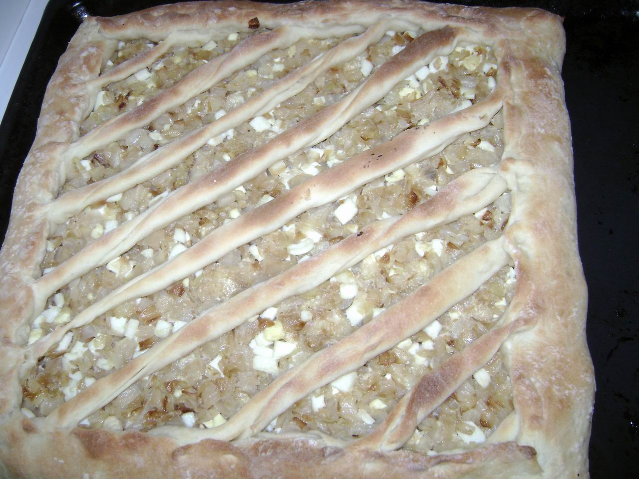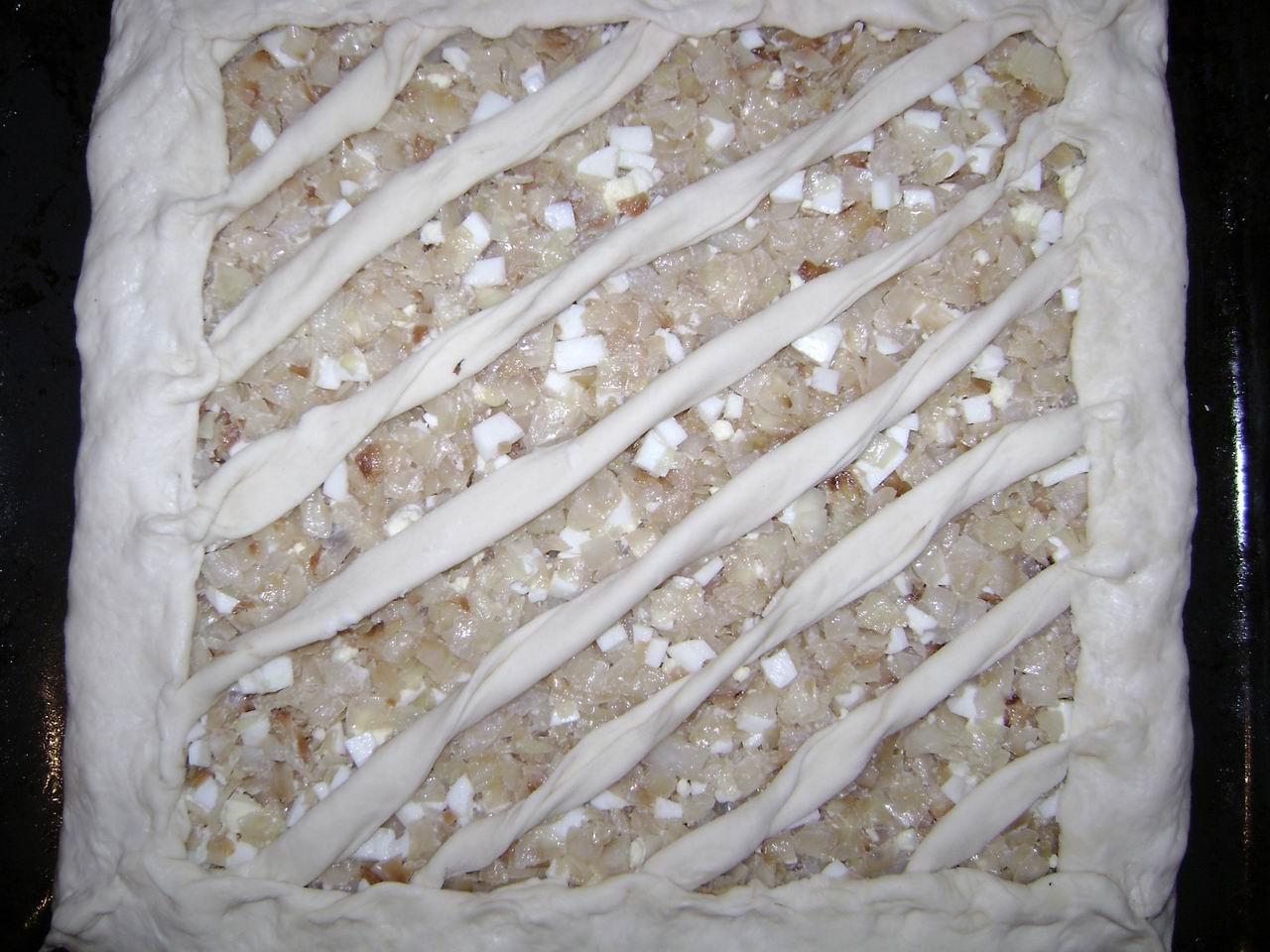 Можно сделать пирог полуоткрытым - сверху положить нарезанные полоски теста.