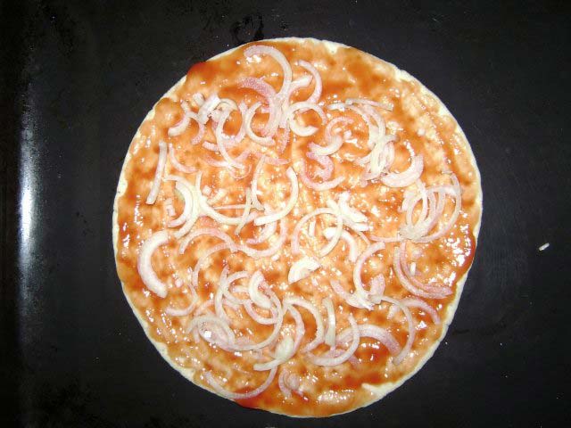 2.Смазать его кетчупом и положить небольшой слой нарезанного лука.