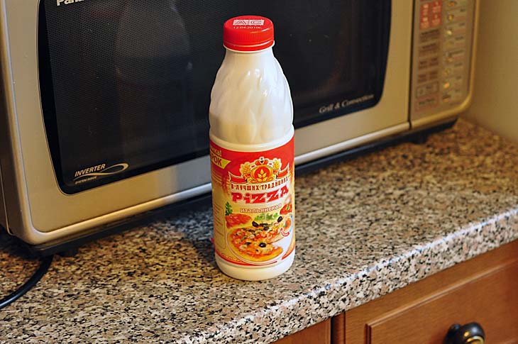 Сейчас в продаже есть множество видов готового теста: дрожжевое и без, сдобное и обычное, для пирожков, для кексов, для блинов и еще много чего другого. Если же покупать уже готовое тесто, то оптимальным вариантом будет самое обычное несдобное, зачастую оно продается в прозрачных пакетах, либо уже замороженным комом. Неплохо получается и на слоеном тесте, оно так же продается в упаковках, обычно по два пласта (2 раздельных или один сложенный пополам). С ним следует проявлять осторожность, т.к. просто положить и ждать пока оттает нельзя - слипнется, желательно еще в замороженном виде разделить на пласты и положить отдельно. Для пиццы я обычно либо замешиваю тесто самостоятельно, либо, что зачастую удобнее и быстрее, использую уже готовую смесь. Продается она вот в таких бутылочках:
